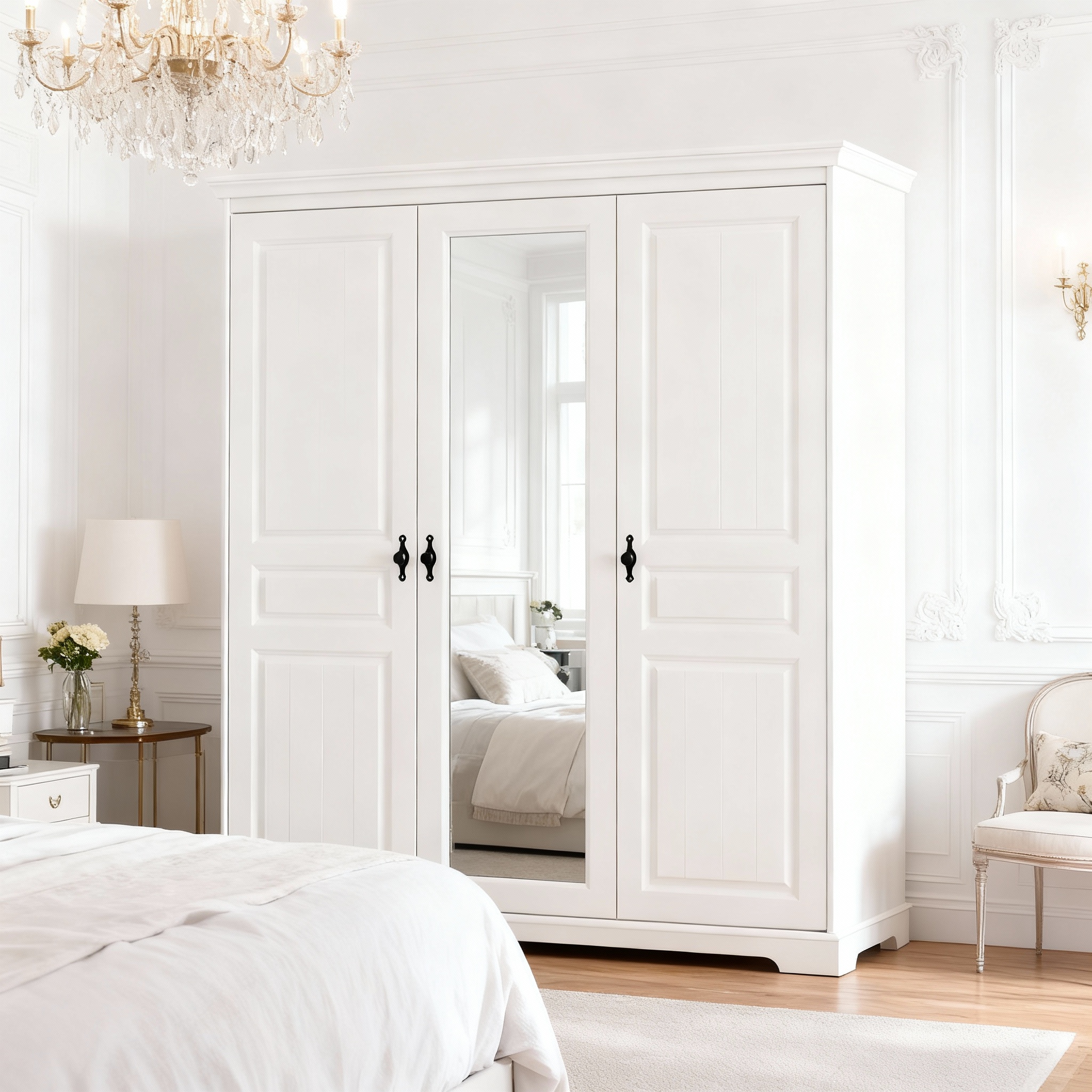 Dulap 3 usi cu oglinda din lemn masiv perfect pentru un dormitor clasic. este disponibil  in finisaj alb cu natur, nuc sau integral alb. Configuratia interior se poate vedea in poze.