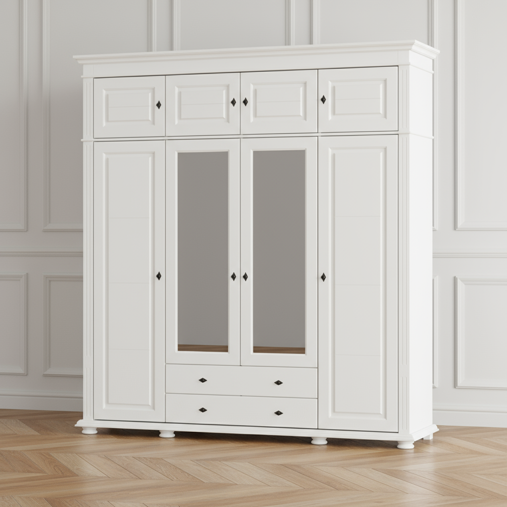 Dulap înalt 4 uși 2 sertare și module suprapozabile, este realizat din lemn masiv și finisat alb, oferind depozitare pe verticală până aproape de tavan pentru dormitoare spațioase. Cele două uși centrale cu oglinzi adaugă luminozitate și funcționalitate, iar interiorul combină bare pentru umerașe, polițe și două sertare inferioare pentru lenjerie și accesorii; detaliile de compartimentare pot fi consultate în poze. Modelul se poate comanda în variantele alb cu natur, alb cu nuc sau integral alb, cu opțiuni de personalizare a mânerelor la cerere.