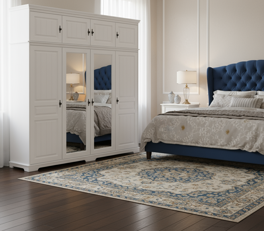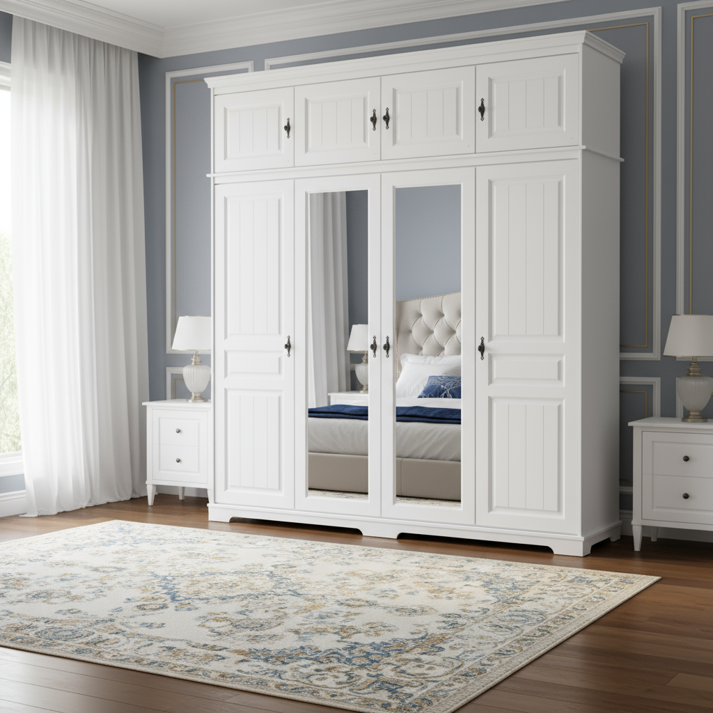 Dulap înalt Cara cu 4 uși cu oglinda, model suprapozabil, este o piesă de mobilier realizată din lemn masiv, ideală pentru dormitoare ce necesită un spațiu generos de depozitare pe verticală. Designul elegant este disponibil în finisaj alb cu natur, nuc sau integral alb, iar configurarea interioară este detaliată în poze. La cerere, mânerele pot fi schimbate, varietățile fiind afișate în secțiunea Poze.