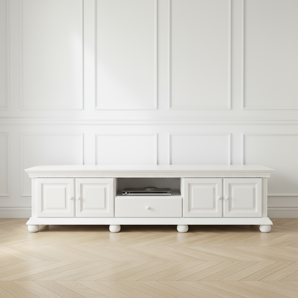 Comoda TV alba din lemn masiv prezentată îmbină eleganța clasică cu funcționalitatea necesară în living, fiind disponibilă în finisaj alb cu blat natur, alb cu blat nuc sau integral alb pentru a se integra ușor în diverse stiluri de amenajare. Construcția solidă din lemn de rășinoase asigură durabilitate, iar fronturile lucrate cu detalii clasice conferă un aspect atemporal. Configurația include două uși cu câte o etajeră în interior, o nișă deschisă pentru echipamente multimedia și un sertar central pentru accesorii, oferind spațiu generos de organizare.