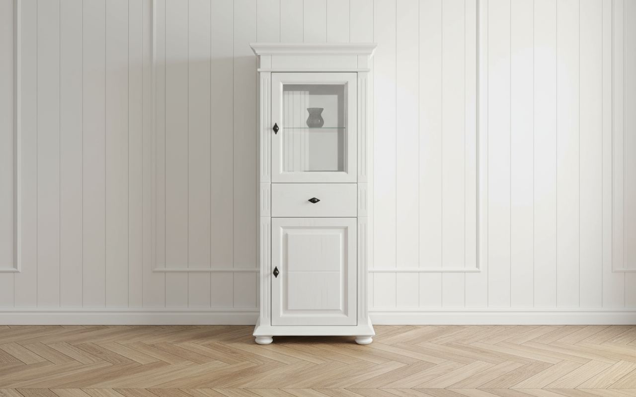 Vitrina living din lemn masiv, realizata in finisaj alb cu blatul natur, nuc sau integral alb. Dulapul cu vitrina are un sertar si doua usi din care una cu sticla. Comandati in completarea setului si comoda tv, polita suspendata si masuta de cafea.