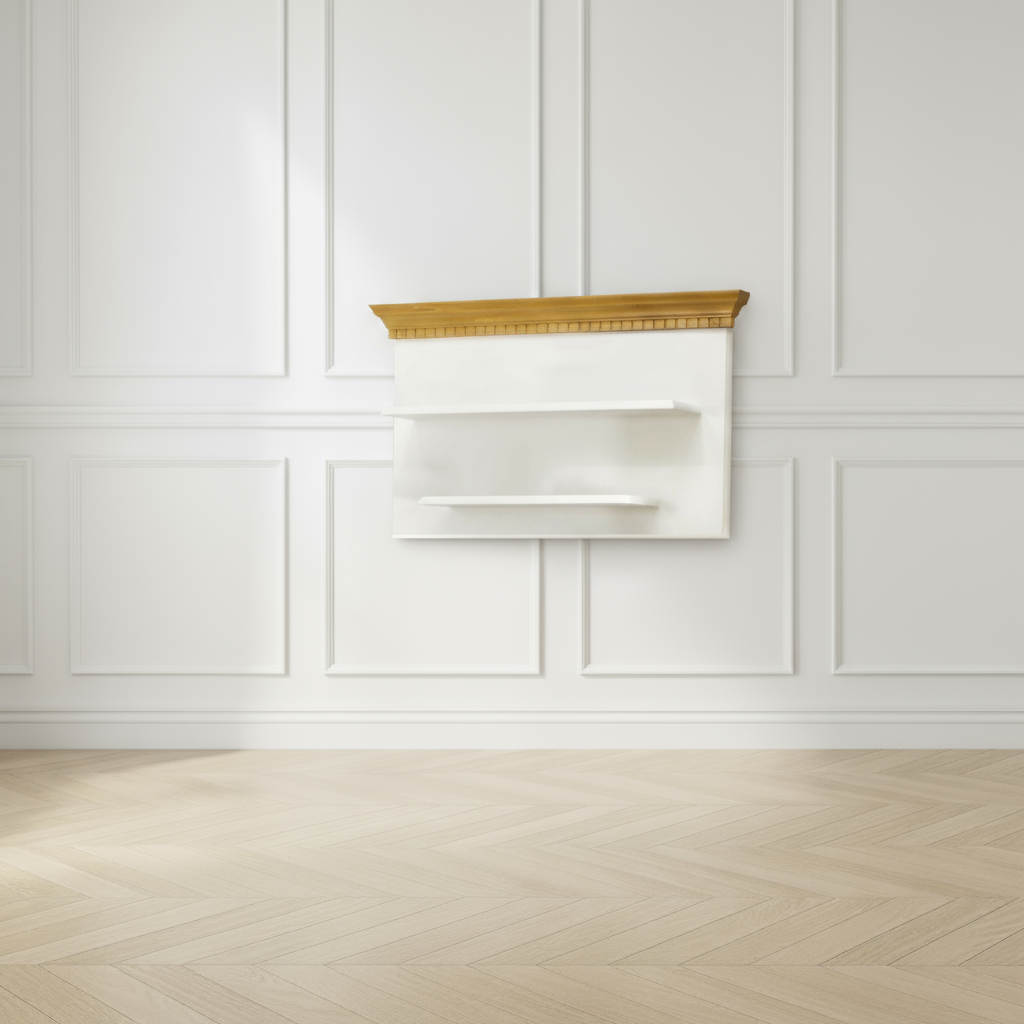 Polița perete suspendată din lemn masiv adaugă o notă rafinată setului Bari, fiind disponibilă în finisaj alb cu cornișă natur, alb cu cornișă nuc sau integral alb pentru integrare ușoară în living. Piesa oferă două etajere pentru expunerea decorurilor sau pentru depozitare ușoară și se montează ideal deasupra comodei TV din aceeași colecție.