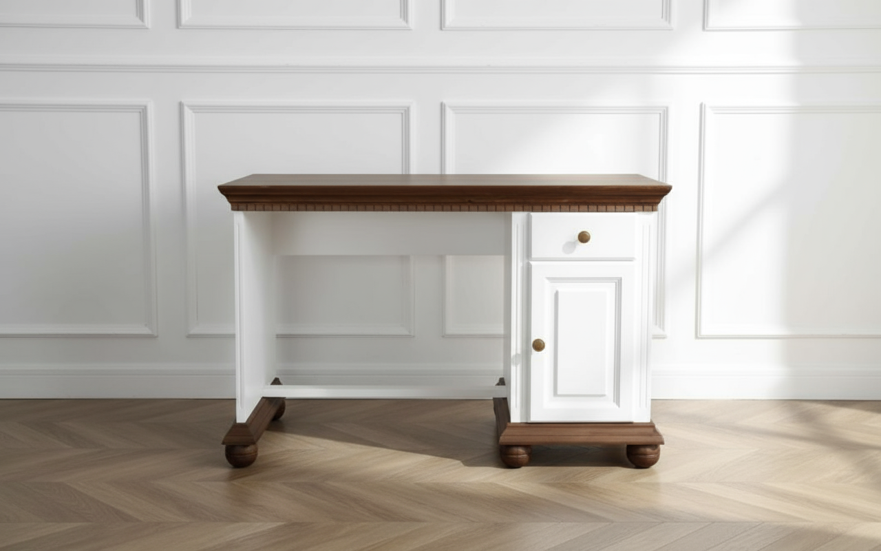Birou lemn masiv alb cu blat nuc Bari, realizat integral din lemn masiv de brad, un material rezistent și durabil, perfect pentru spațiul de studiu. Finisajul alb cu nuc îi oferă un aspect elegant și modern, potrivit atât pentru camere clasice, cât și pentru cele contemporane.