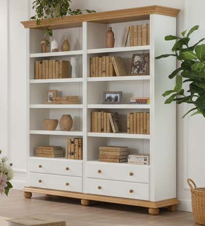 Bibliotecă lemn masiv alb cu natur– spațioasă și elegantă